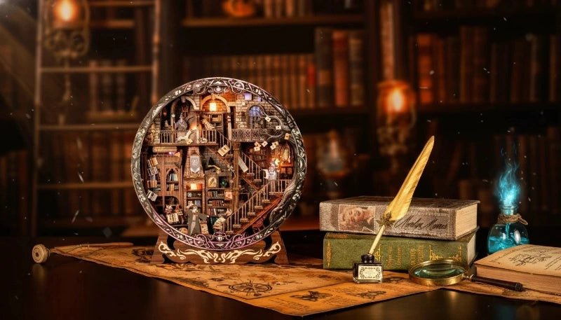 Book Nook - Ancient Book Collection Room ist ein Kunstwerk, das die Faszination klassischer Buchsammlungen mit präziser mechanischer Gestaltung perfekt vereint. Dieses Book Nook zieht nicht nur mit der geheimnisvollen Atmosphäre antiker Bücher die Aufmerksamkeit auf sich, sondern beeindruckt auch mit einem drehbaren Zahnrad-Bücherkorb, der dem gesamten Szenario eine dynamische Note verleiht.